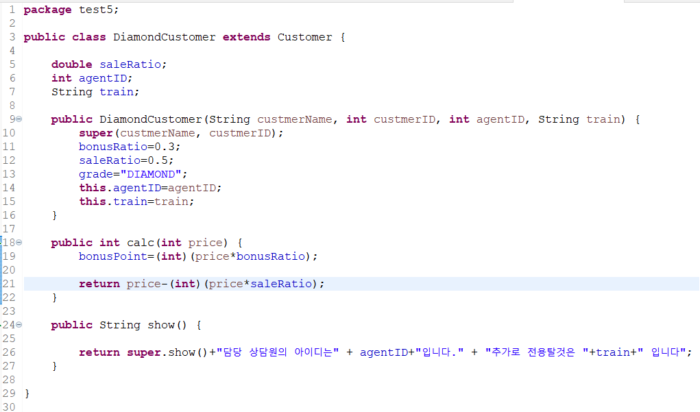 1. VIP, Gold 클래스의 부기능까지 포함된 Diamond클래스이다. 상속기능을 활용하여 Silver클래스와의 동일한 기능은 부여받는다.(super() 를 쓴다.)