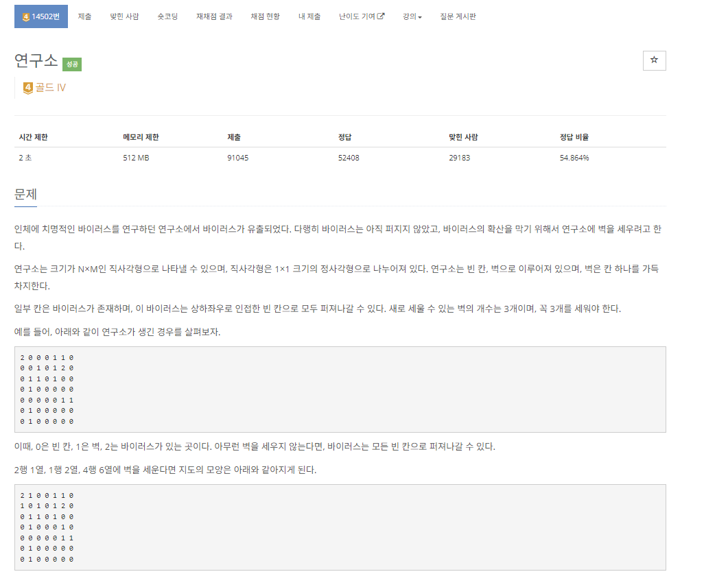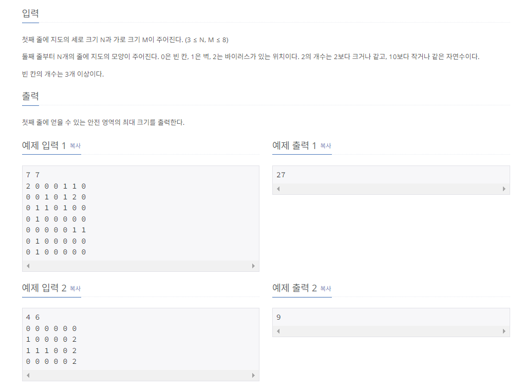- 하지만 벽을 무조건 3개 세우는 알고리즘을 도대체 어떻게 구현을 해야하는지 정말 많은 고민을 해왔다. 전체 경우의 수를 구해서 for 구문을 세울려고 했지만 이거는 너무 노가다일뿐더러 오히려 짜기 복자했고 bfs로 구현할라해도 좀 뭔가 안맞아서 고민을 했다... 결국 다른 분들꺼를 참고해서 분석해본결과 dfs 즉 재귀함수를 이용하면 된것이었다... 하지만 필자가 재귀함수 지식이 너무 부족해 힘들었다... 공부를 많이 해야겠다!