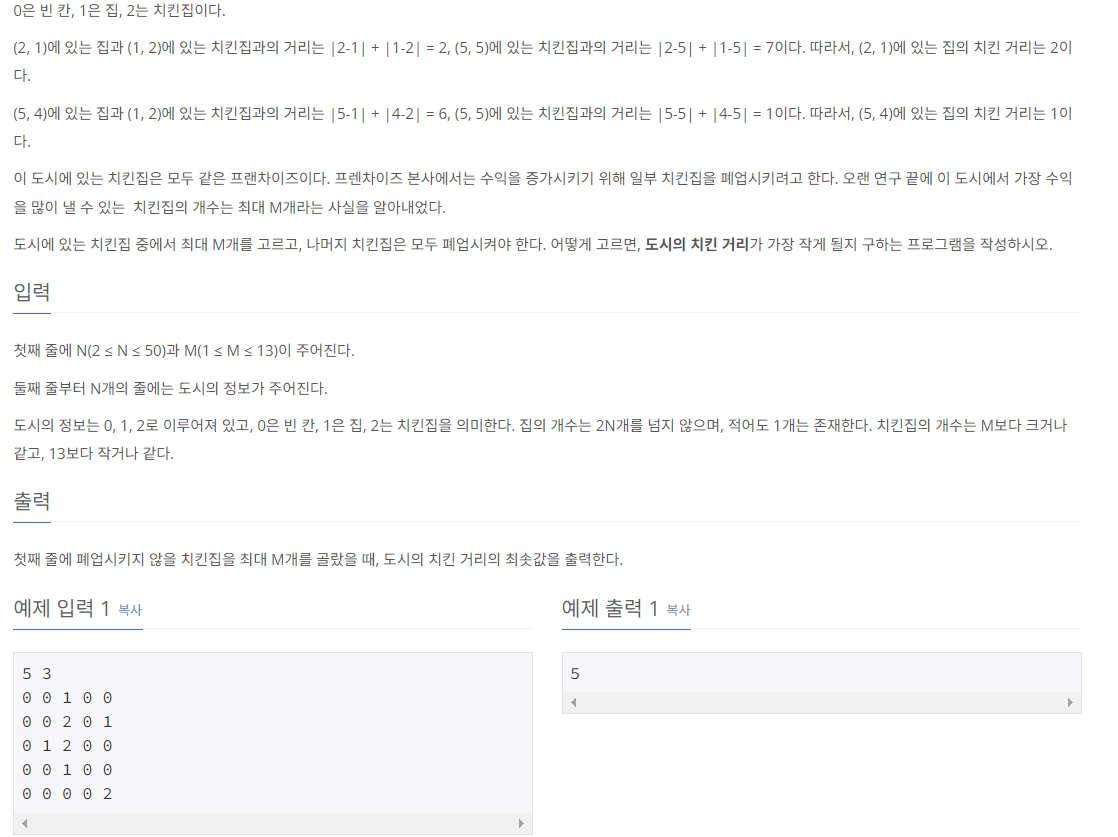 즉 입력부분에서 치킨집 즉 2가 5개 이므로 이 중 2개를 뽑아 집 즉 1과 거리가 최소가 나는 기준으로 치킨집(2)를 2개 뽑아야되는게 핵심이다!