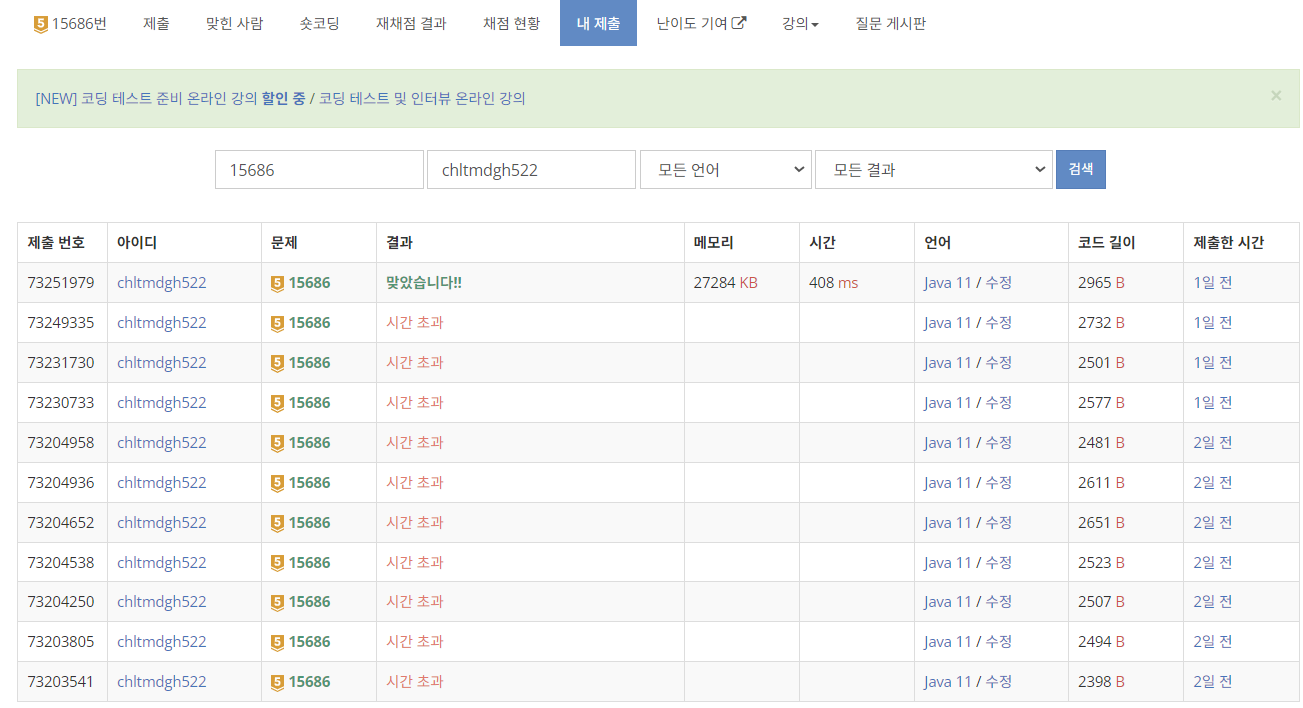 위와 같은 문제점으로 해결을 해도 여전히 시간초과가 떴다...