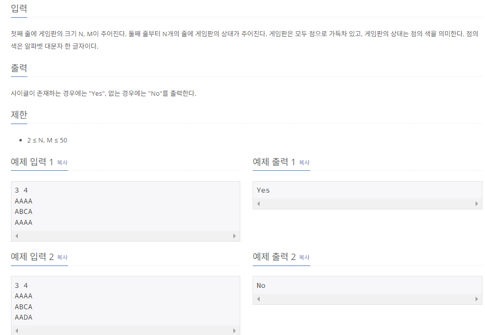 문제는 간단했다. 똑같은 문자를 기준으로 1개의 순환 구조만 있으면 Yes 아니면 No만 뜨게 하는 문제이다.