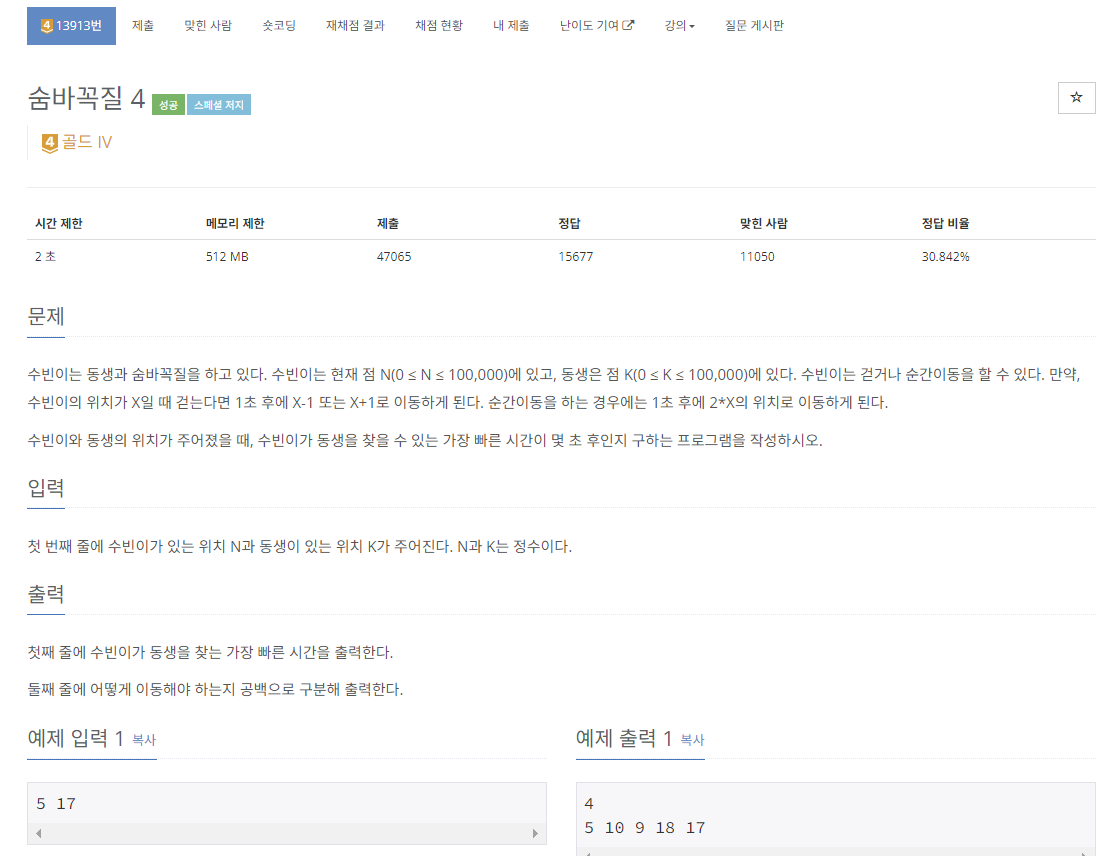 수빈이는 동생과 숨바꼭질을 하고 있다. 수빈이는 현재 점 N(0 ≤ N ≤ 100,000)에 있고, 동생은 점 K(0 ≤ K ≤ 100,000)에 있다. 수빈이는 걷거나 순간이동을 할 수 있다. 만약, 수빈이의 위치가 X일