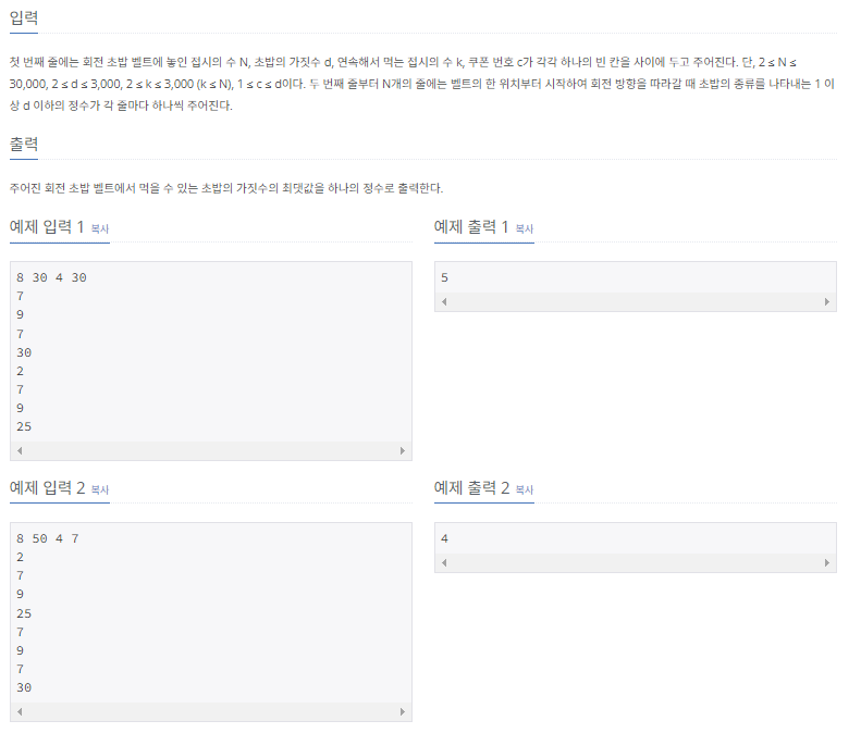 즉 쿠폰을 이용하여 최대 초밥을 먹을 수 있는 종류를 구하는 문제이다.
