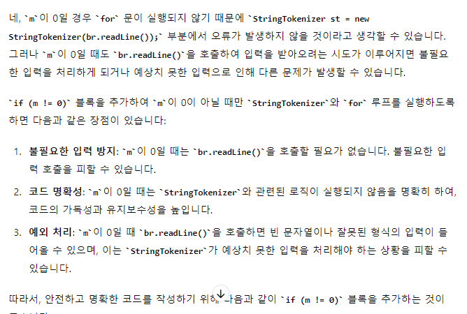 왜냐하면 M이 0일때 실행이 되면 애초에 br.readline이 널인 상태로 받아오기 때문에 오류가 난거라고 ...