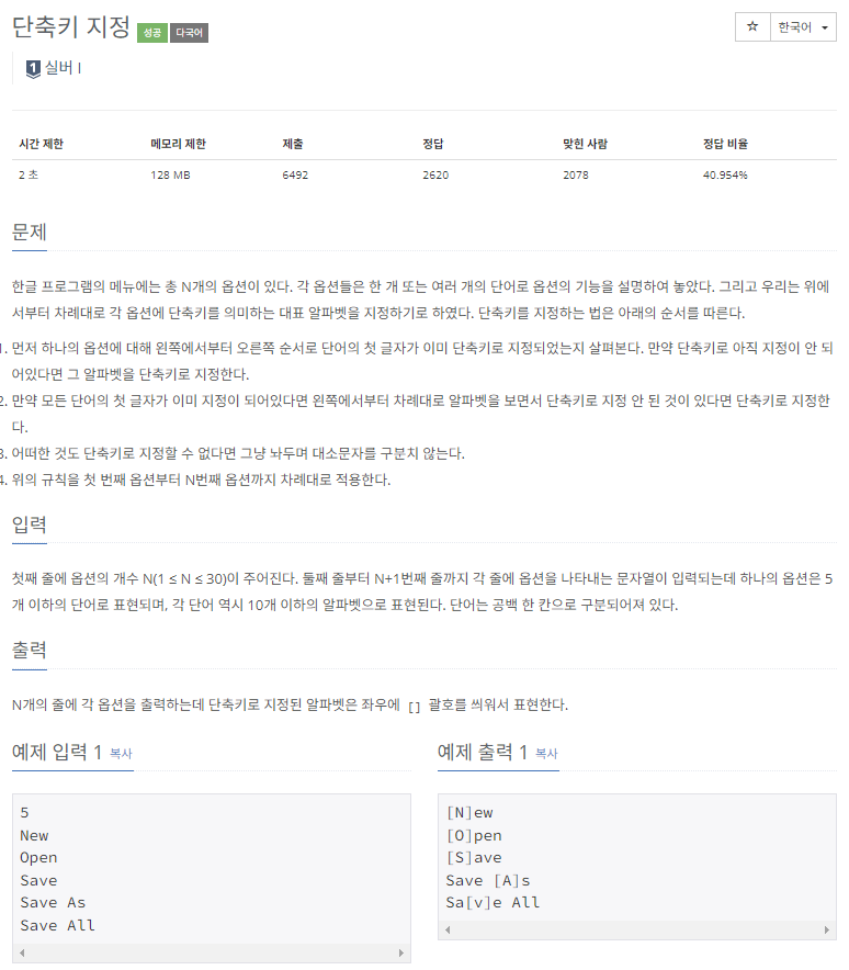 핵심은 첫 글자가 단축키로 이미 지정됐는지 확인하고, 만약 되어 있다면 그다음 알파벳을 단축키로 지정하면 되는 거였다. 여기서 띄어쓰기도 고려해야 했고, 단어 단위로 생각해야 해서 복잡했다.