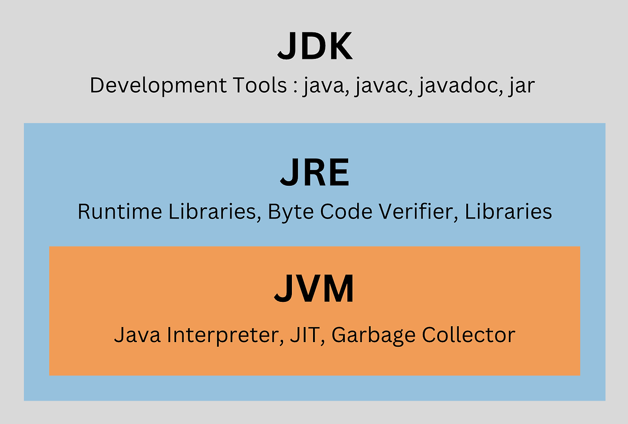 즉, JDK는 JRE를 포함하고, JRE는 JVM을 포함하는 구조입니다.
