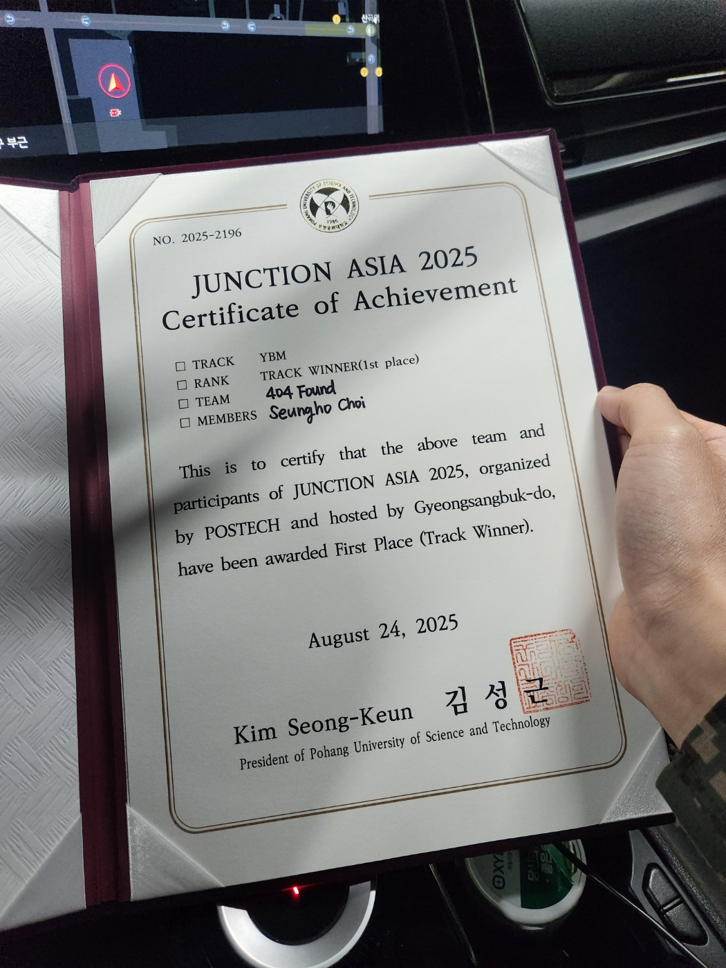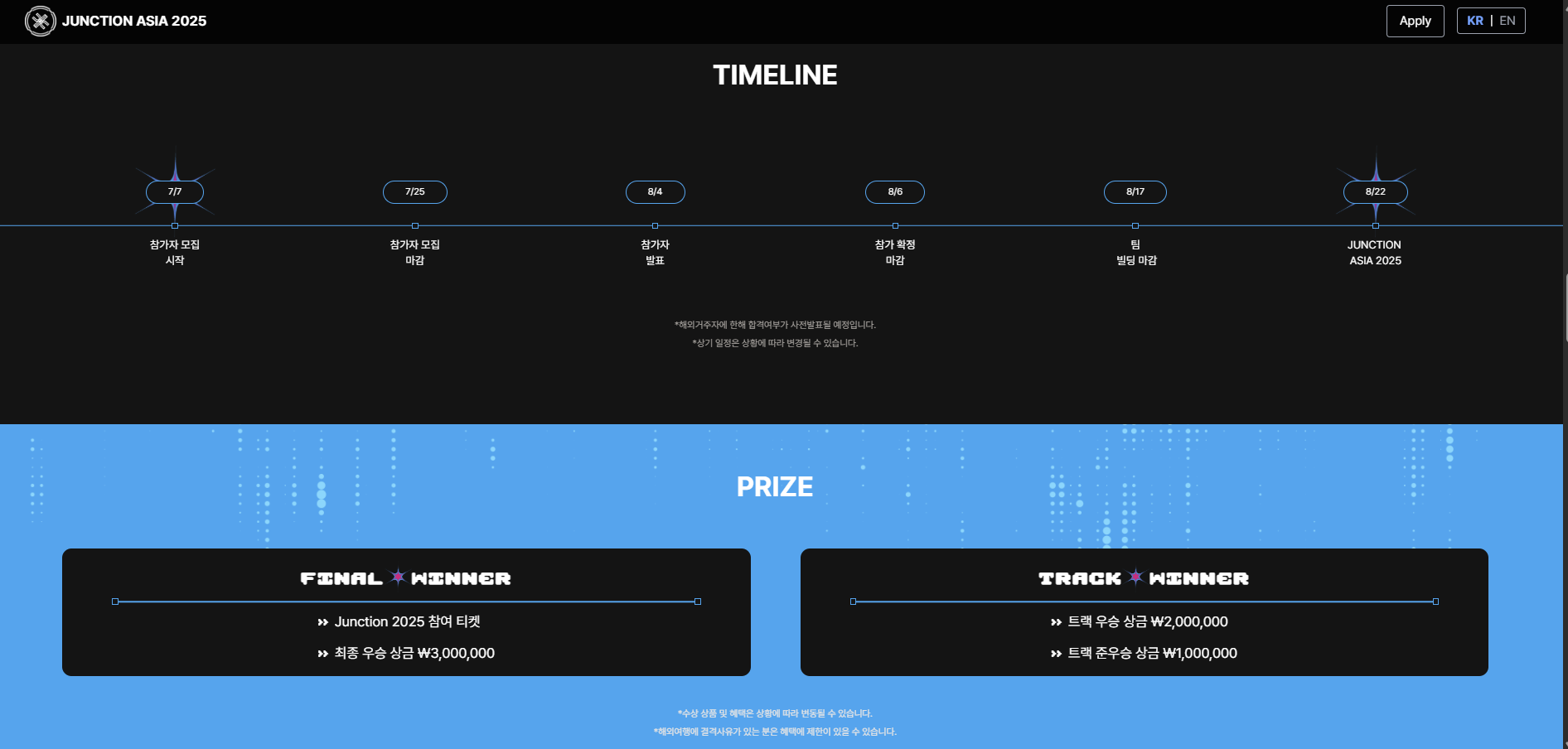 7월 말, Junction Asia 해커톤 모집공고를 발견했다. 당연히 해커톤 킬러인 나로서는 참여하고 싶었지만, 포항까지 가야 하는 2박 3일 일정에 교통비와 숙식비 지원도 전혀 없다는 조건이 부담스러웠다. 구름톤과 비교하면 아쉬운 부분이었지만, 역대 해커톤 중 가장 큰 규모라는 점과 새로운 사람들을 만날 기회라는 매력에 결국 지원하기로 했다.
