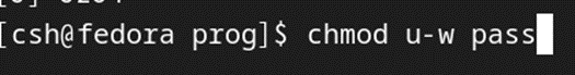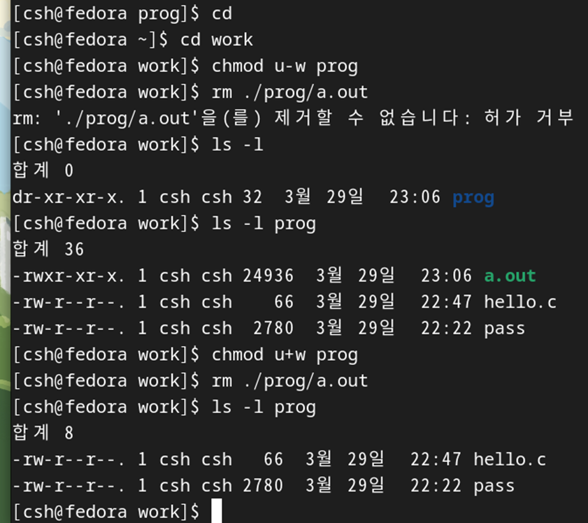 다음과 같이 w모드를 삭제하면 파일삭제를 못하고 w모드를 추가시키면 a.out파일을 삭제할 수 있다.