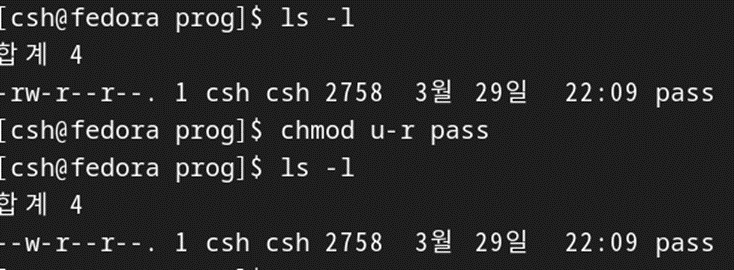 pass파일을 user 모드에서 읽기모드(r) 제거했더니 파일을 못읽는다.