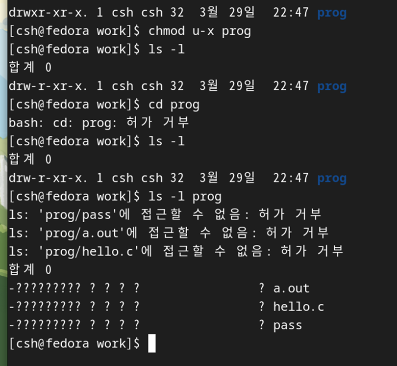 디렉토리 prog x모드를 제거하면 다음과 같이 디렉토리 내부로 이동이 불가능해지며 디렉토리 내부 파일 검색을 못한다.