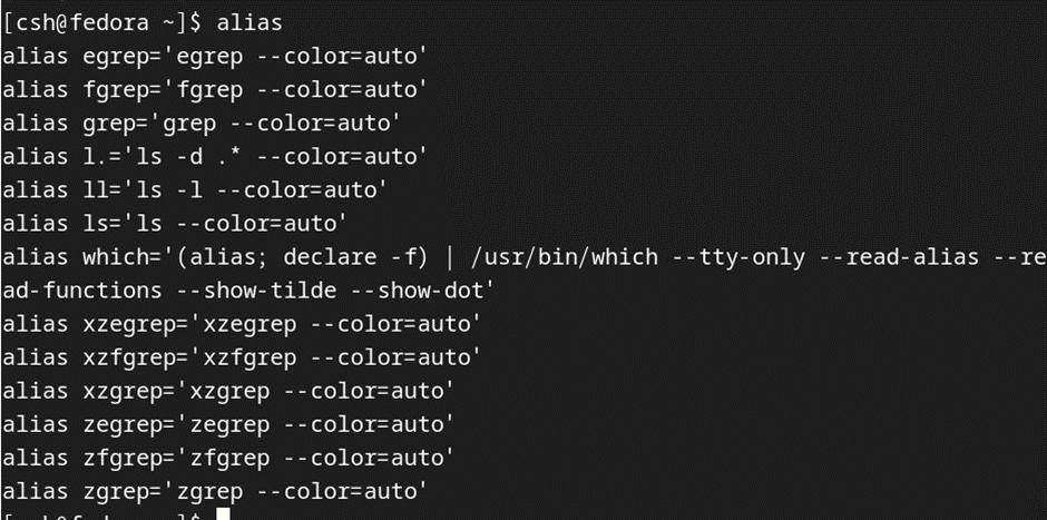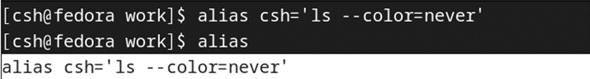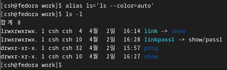 alias ls=’ls –color=never’ 명령어를 통해 바뀐 것을 확인할 수 있다.