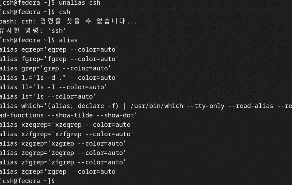 다음과 같이 unalias를 통해 사용자계정 별명을 해재시켰다.