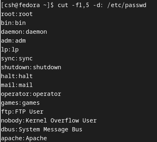 저 뜻은 /etc/passwd 파일에서 : 기준으로 1번째와 5번를 출력하라는 의미이다.